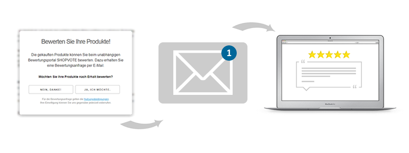 Um eine Bewertungsanfrage an Ihre Kunden versenden zu können, wird deren vorherige Einwilligung in den Erhalt einer solchen benötigt. Dazu haben wir ein Tool entwickelt, das Sie in Ihr Shopsystem integrieren, um automatisch nach dem Kauf die Einwilligung Ihrer Kunden zu erhalten. Nach erfolgter Einwilligung wird nach einem bestimmbaren Zeitfenster die Bewertungsanfrage per E-Mail an die Kunden versendet. Für die Abgabe der Bewertung müssen sich Ihre Kunden nicht registrieren.